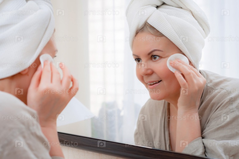 Портрет симпатичная пожилая женщина с руками на зеркале дома после ванной Уход за кожей после 50-60 лет