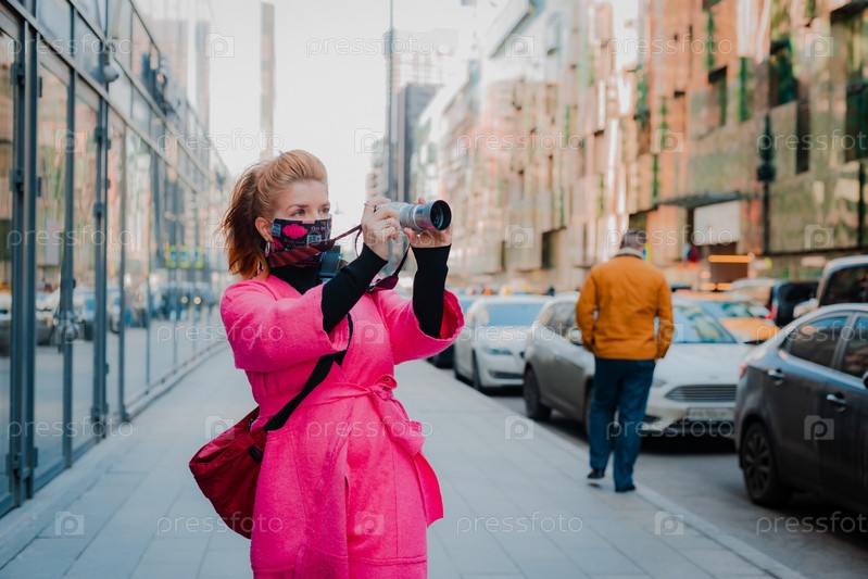 Женщина в ярко-розовом пальто - туристка с камерой в стильной гламурной модной защитной маске на лице от зараженного вирусом воздуха. Россия Москва 10 марта 2020 г