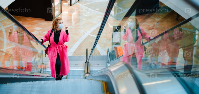 Красивая женщина в розовом надевает медицинскую маску для защиты от коронавируса, боясь заразиться, поднимается по эскалатору в торговом центре