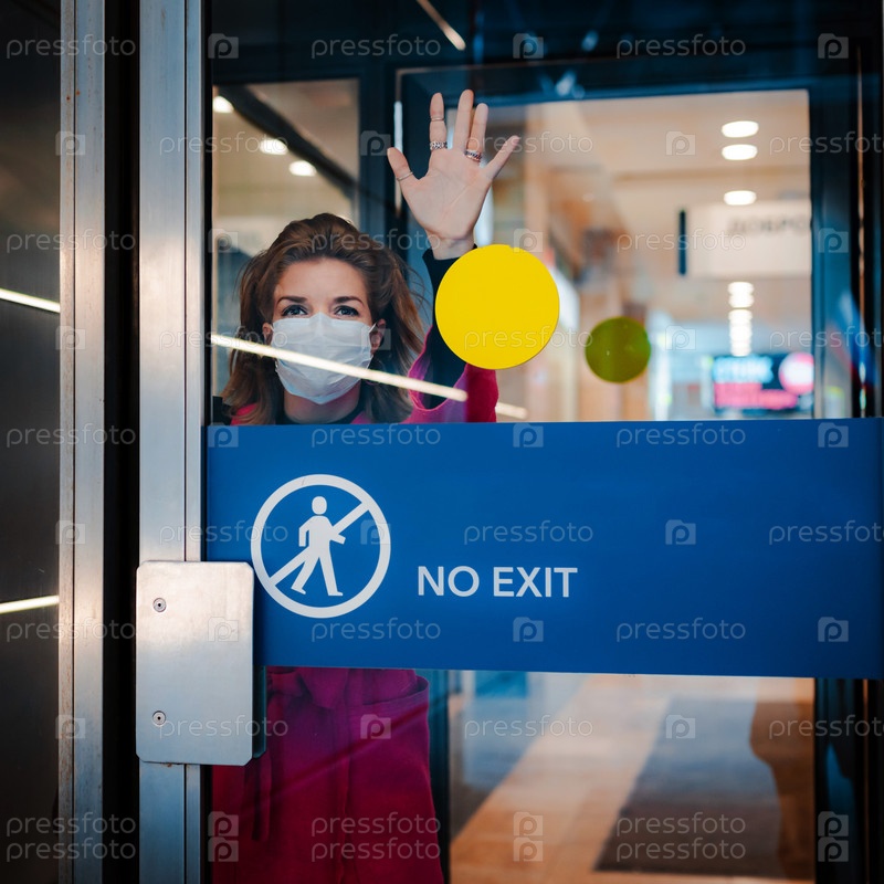Остановить инфекцию. женщина показывает стоп-жест через стеклянную дверь, выхода нет. девушка носит защитную маску от инфекционных заболеваний гриппа в общественном месте