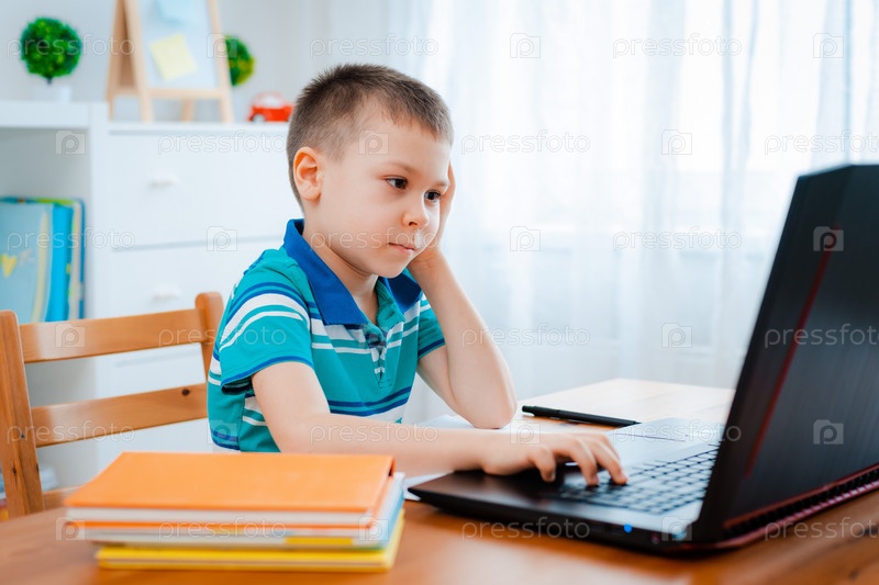 Дистанционное обучение онлайн образование. Школьник учится дома и делает домашнее задание. Домашнее дистанционное обучение