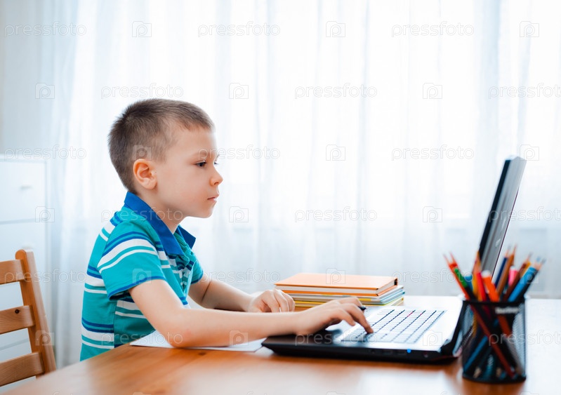 Дистанционное обучение онлайн образование. Школьник учится дома и делает домашнее задание. Домашнее дистанционное обучение