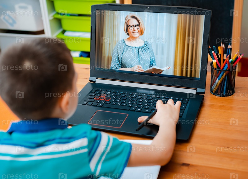 Дистанционное обучение онлайн образование. Школьник учится дома и делает домашнее задание. Домашнее дистанционное обучение