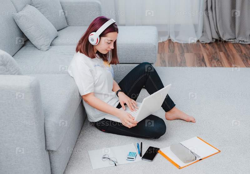 Молодая девушка школьница-подросток сидит в наушниках на полу в гостиной студент учится дома работает с ноутбуком делает домашнее задание. Концепция дистанционного обучения во время карантина ковид-19 коронавируса