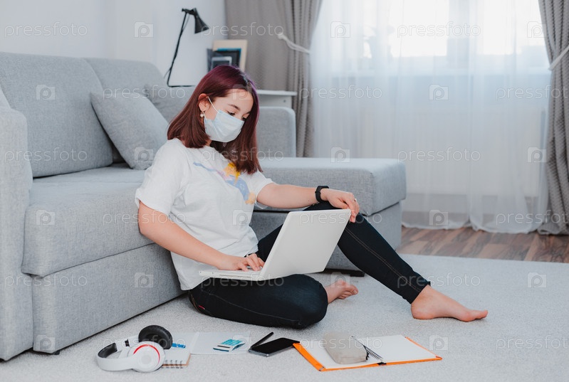 Школьница-подросток в медицинской маске против вирусов сидит на полу гостиная диван студент учится дома ноутбук делает домашнее задание