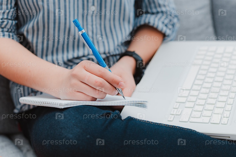 Студентка учится дома, работает со своим ноутбуком, делает домашнее задание крупным планом. Концепция дистанционного обучения во время карантина