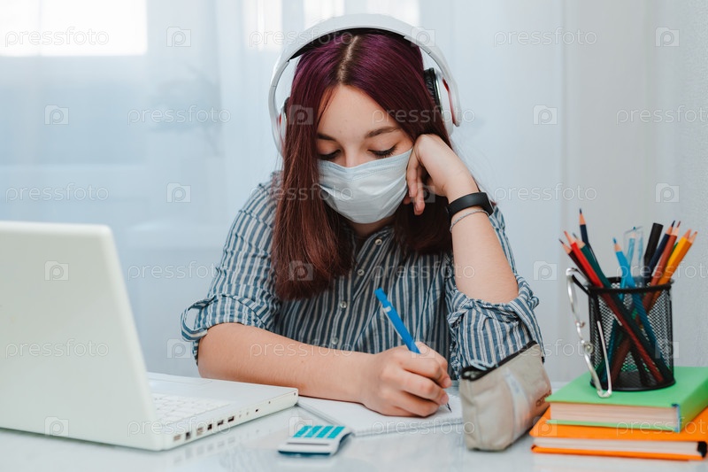Школьница-подросток в медицинской маске против вирусов сидит на полу гостиная диван студент учится дома ноутбук делает домашнее задание