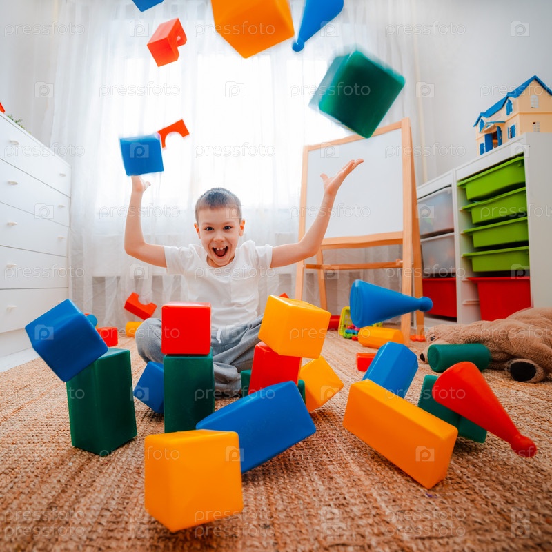 Мальчик смеется, сидя на полу в детской комнате, подбрасывая игрушечные цветные пластиковые кубики