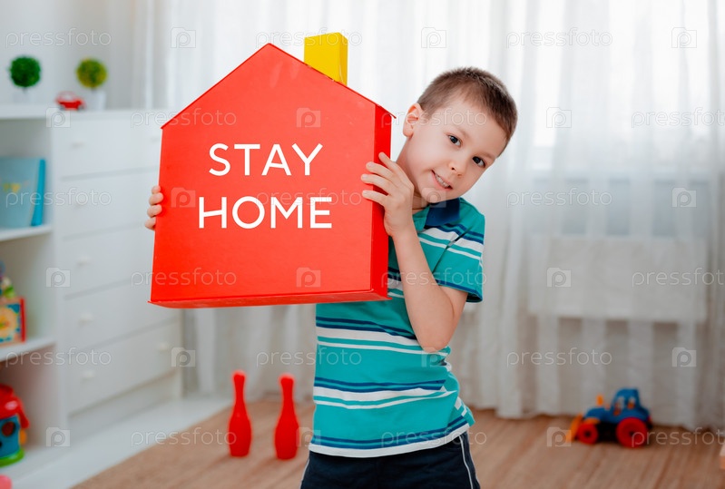Дети мальчик руки, держа модель красный дом с примечанием слова Оставайтесь дома. профилактика и защита от пандемии коронавируса