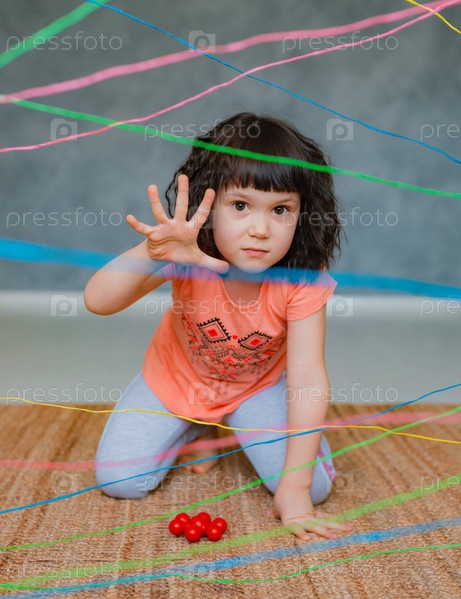 Маленькая девочка лезет через веревочную паутину, квест с препятствиями в помещении