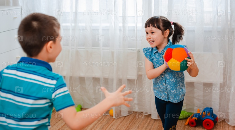 Родные дети мальчик и девочка играют в детской игровой комнате, бросая мяч. Концепция взаимодействия малышей, общение, взаимная игра, карантин, самоизоляция дома