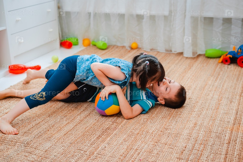 Родные дети мальчик и девочка играют в детской игровой комнате, бросая мяч. Концепция взаимодействия малышей, общение, взаимная игра, карантин, самоизоляция дома