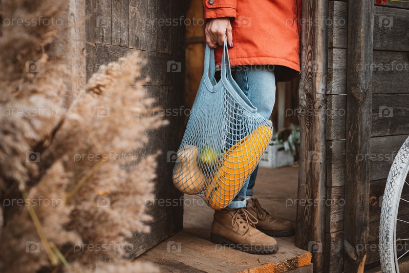 Женщина держит авоську с осенними сезонными овощами, стоя у двери старого деревянного дома
