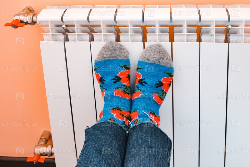 Крупный план ног, одетых в теплые носки, на белой батарее центрального отопления