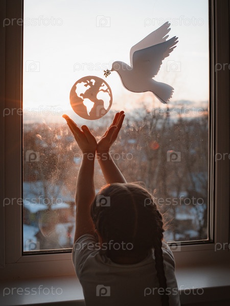 Ребенок протягивает руки солнечный свет закат за окном летит голубь мир с веткой силы глобус. концепция мира во всем мире, никакой войны, экология, защита планеты Земля, пацифизм