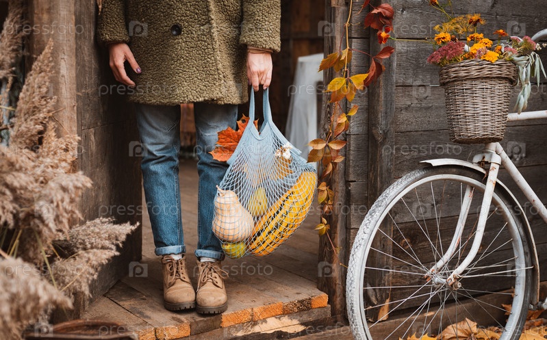 Обрезанный снимок женщины, держащей авоську с осенними сезонными овощами, тыквой, цуккини и грушами, стоящей у двери старого деревянного дома в деревне, старинный велосипед, прислонившийся к стене. Осенний урожай