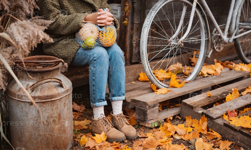 Обрезанный снимок женщины, держащей авоську с осенними сезонными овощами, тыквой, цуккини и грушами, стоящей у двери старого деревянного дома в деревне, старинный велосипед, прислонившийся к стене. Осенний урожай
