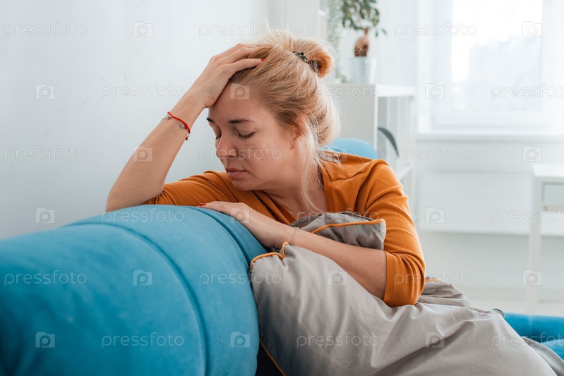 Несчастная одинокая депрессивная женщина дома, она сидит на диване, пряча подушку для лица, концепция депрессии астения