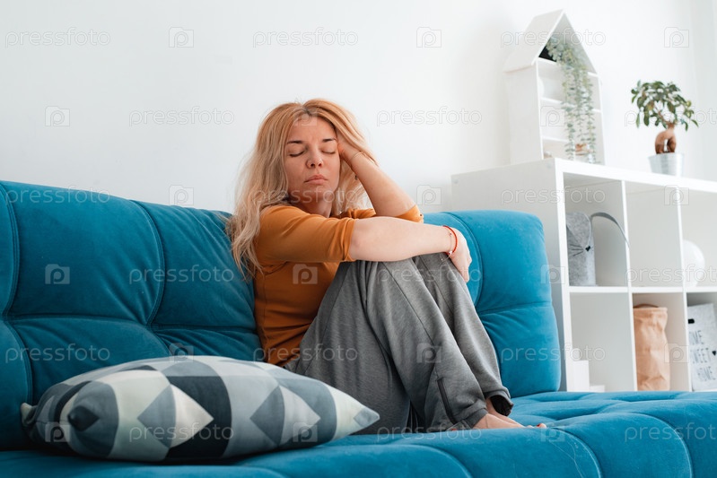 Несчастная женщина в депрессии, трогает волосы, сидит дома на полу, думает о проблемах, расстроенная девушка чувствует себя одинокой и грустной, психологическими и психическими проблемами, страданиями