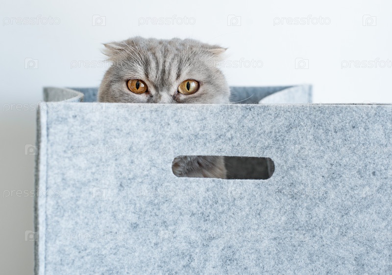 Портрет смешного породистого шотландского вислоухого кота, выглядывающего из серой войлочной корзины, на белом фоне