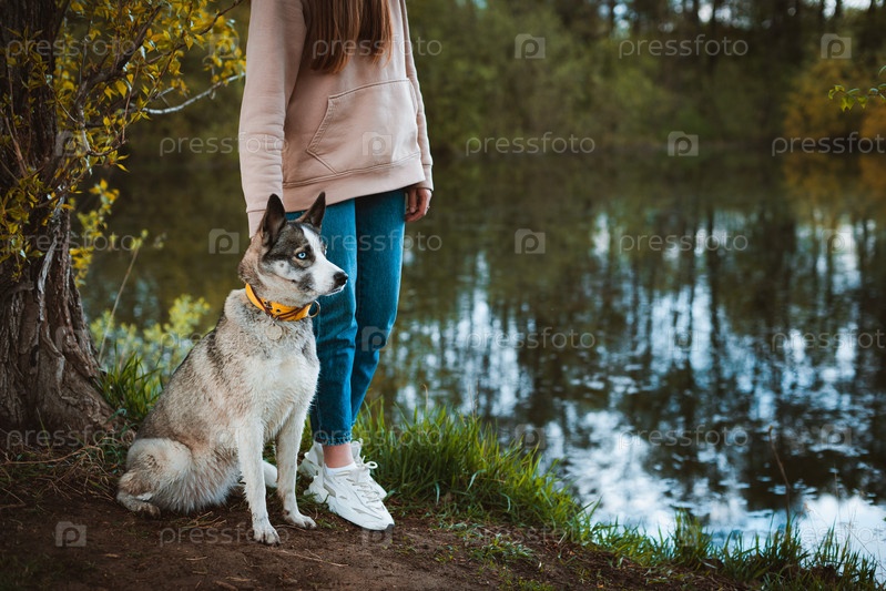 Выгульщик женского пола с домашним животным, гуляющим на природе у реки