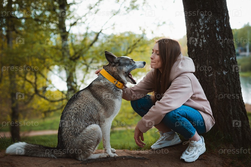Выгульщик женского пола с домашним животным, гуляющим на природе у реки