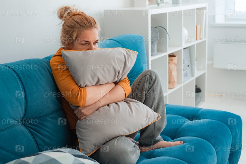 Несчастная одинокая депрессивная женщина дома, она сидит на диване, пряча подушку для лица, концепция депрессии астения