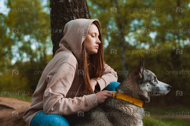Выгульщик женского пола с домашним животным, гуляющим на природе у реки