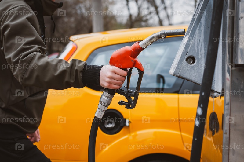 Неузнаваемый мужчина заправляет машину бензином на заправке. Концепция высоких цен на бензин, санкции, Россия