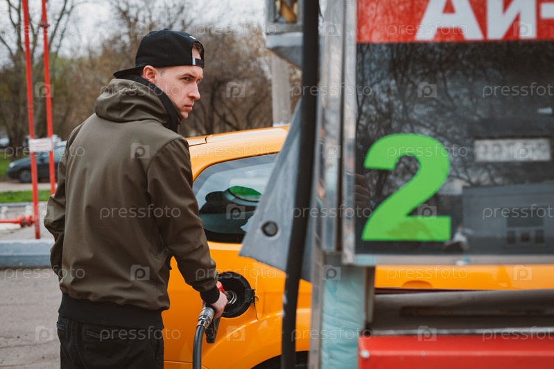 Неузнаваемый мужчина заправляет машину бензином на заправке. Концепция высоких цен на бензин, санкции, Россия