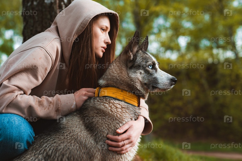 Выгульщик женского пола с домашним животным, гуляющим на природе у реки