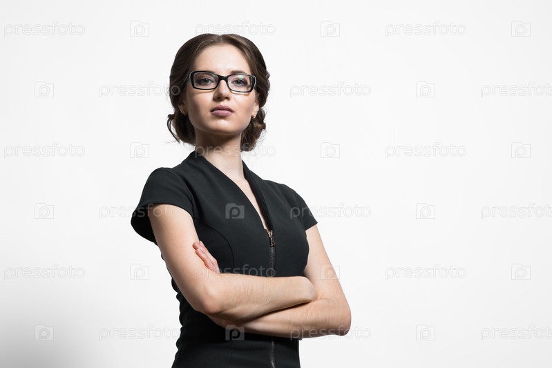 Портрет привлекательной молодой кавказской деловой женщины со скрещенными руками на сером фоне