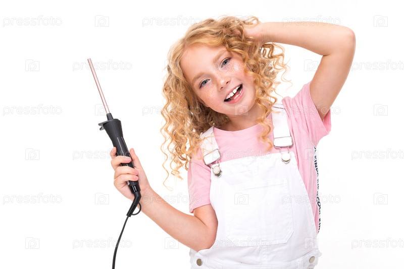 Улыбающаяся блондинка крутит волосы бигуди на белом фоне