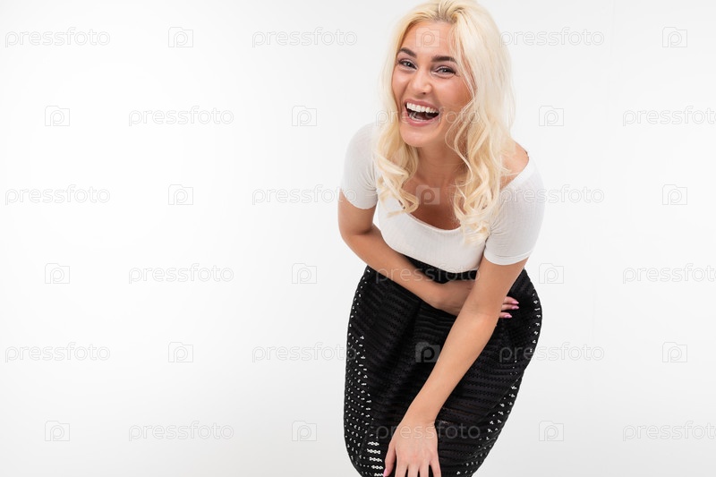 Девушка в белой майке и черной юбке смеется на белом фоне с копией пространства