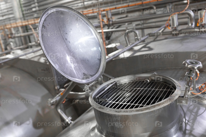 Серые банки в здании завода. Пищевая промышленность. Детали распределительной системы современного пивоваренного завода. Оборудование и промышленные инструменты