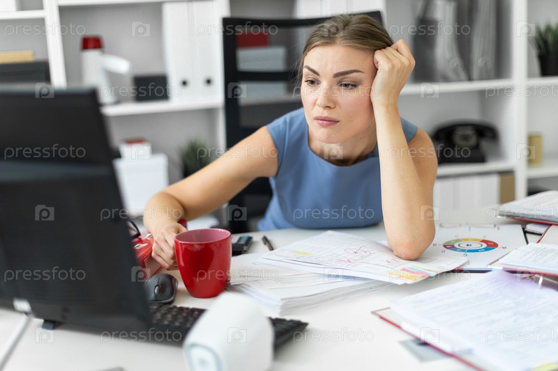 Красивая молодая девушка в голубом платье работает в офисе. фото с глубиной резкости