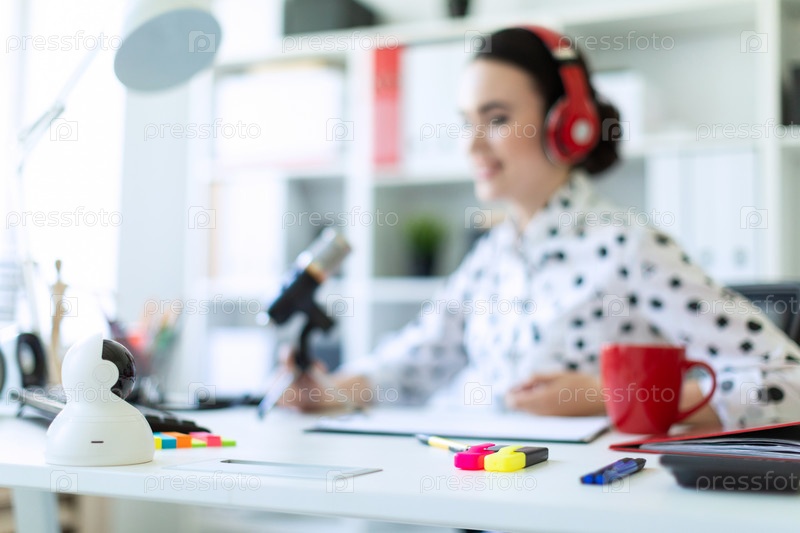 Девушка в офисе с маркерами и калькулятором. Фотография с глубиной резкости, выделенным фокусом по маркерам