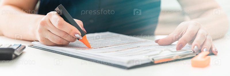 Изящные женские руки работают с маркером и анкетой. Очаровательная молодая девушка, работающая в ярком офисе. фото с глубиной резкости