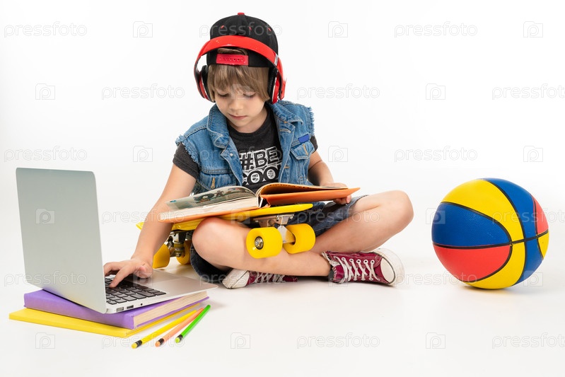 Фотография мальчика-подростка, сидящего на полу в джинсовой куртке и шортах. кроссовки с желтым пенни, красные наушники, ноутбук, мяч и играть в компьютерные игры или делать домашнее задание на белом фоне