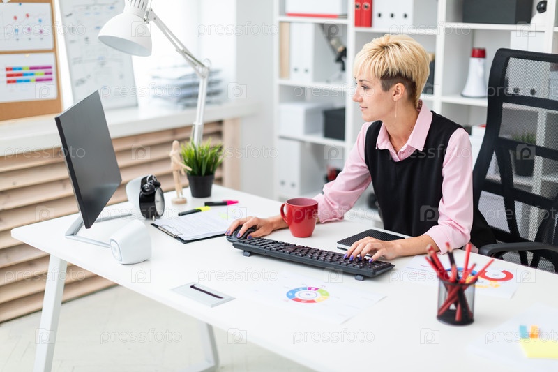 Девушка работает в офисе за компьютером