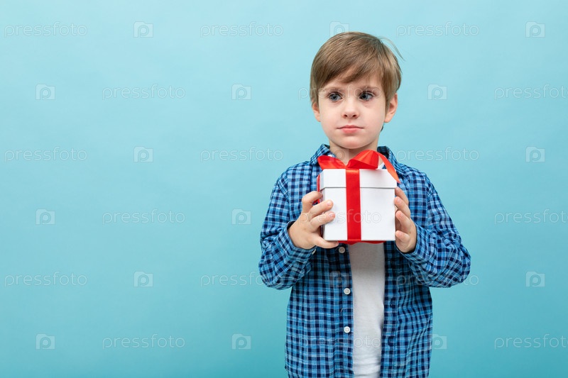 мальчик держит белую коробку с подарком, портрет на синем фоне