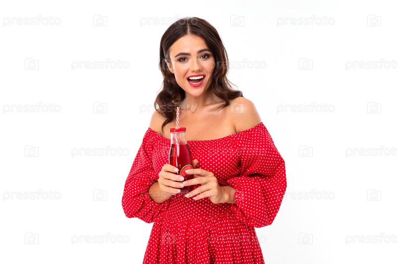 Портрет милой девушки пьет сок на белом фоне