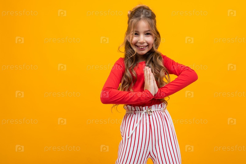 Очаровательная девушка-подросток в красной блузке и полосатых брюках показывает эмоции на желтом фоне с копией пространства