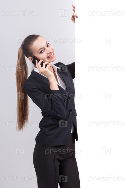 Изображение красивой бизнес-леди разговаривает по телефону