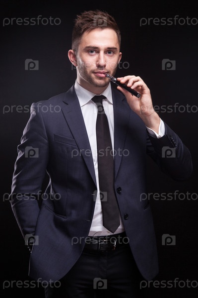 Изображение серьезного бизнесмена, стоящего с устройством для вейпинга