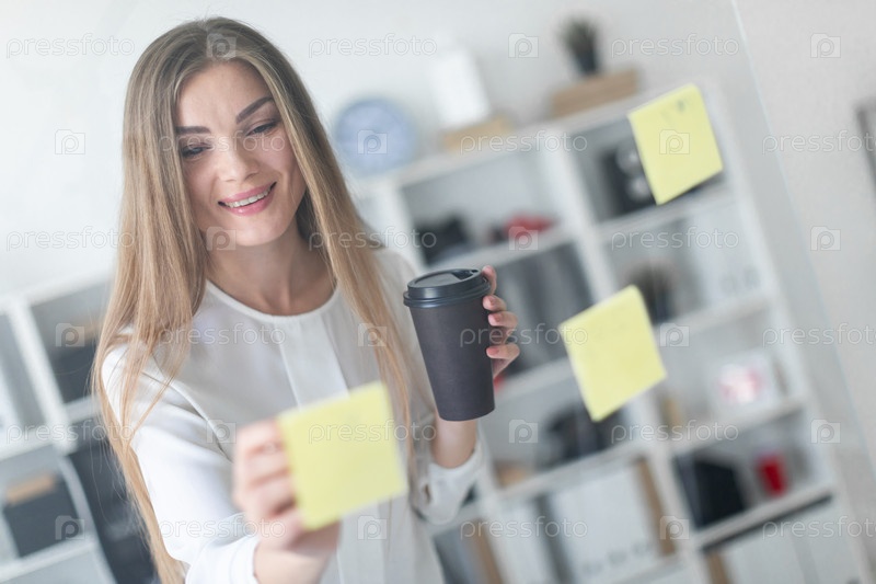 Молодая девушка стоит возле прозрачной доски с наклейками и держит стакан с кофе и ручку