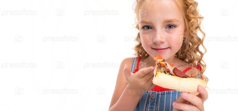 Маленькая девочка с рыжими волосами в красной майке и сине-белом комбинезоне в полоску ест большую пиццу