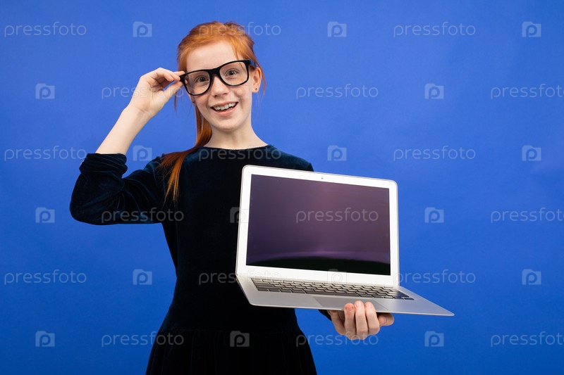 Умная рыжеволосая девочка-подросток в очках держит ноутбук с макетом пустого экрана, чтобы вставить страницу на синем фоне
