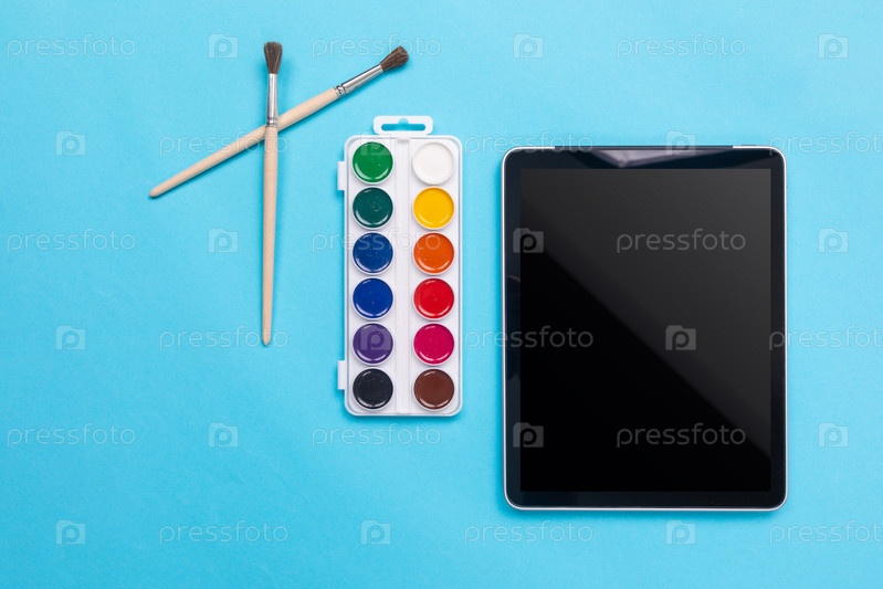 Акварельные краски и кисть с планшетом на синем фоне