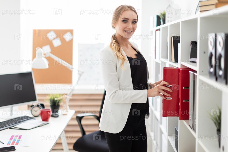 Молодая девушка стоит возле стойки в офисе и достает папку